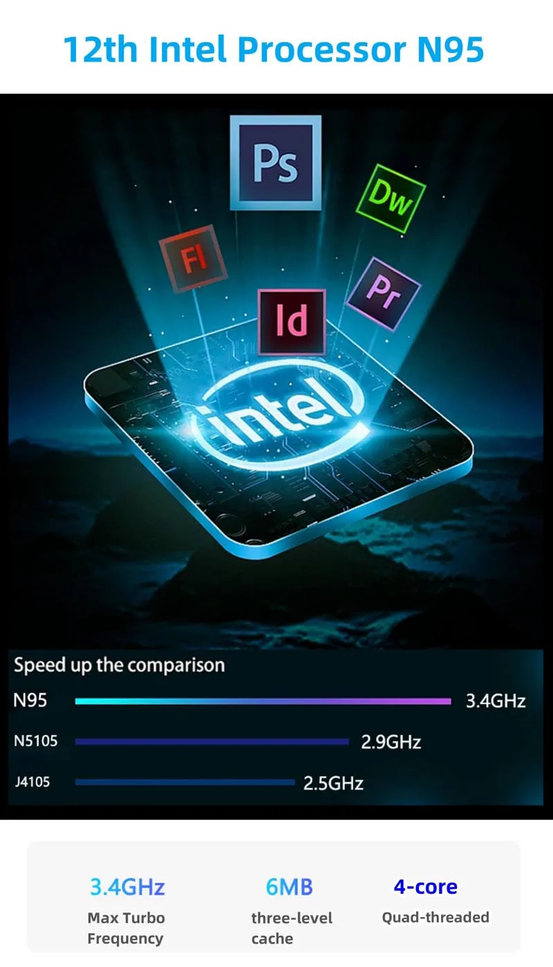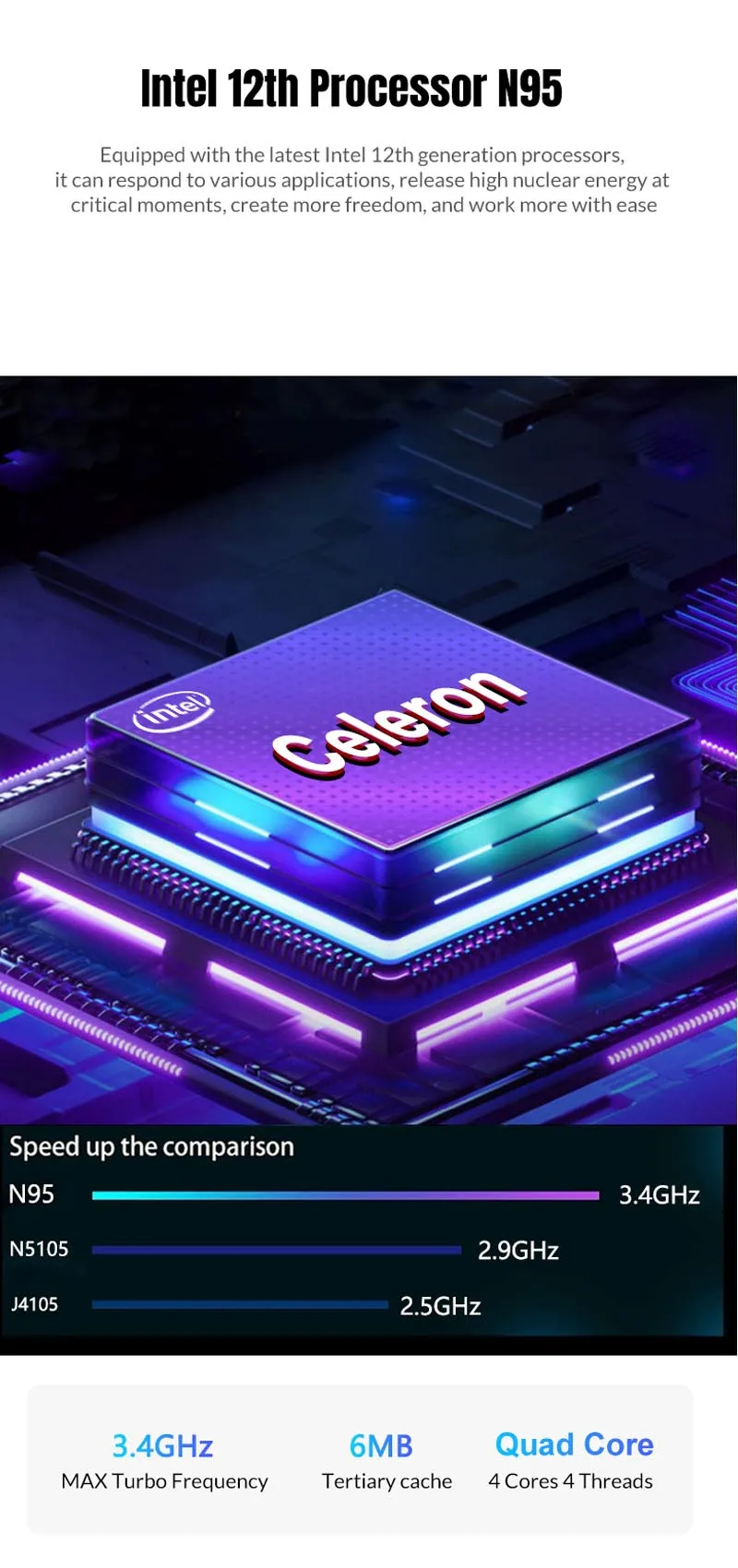 CPU:Intel® Processor N95,4Cores4Threads ,Max Turbo Frequency3.40GHz